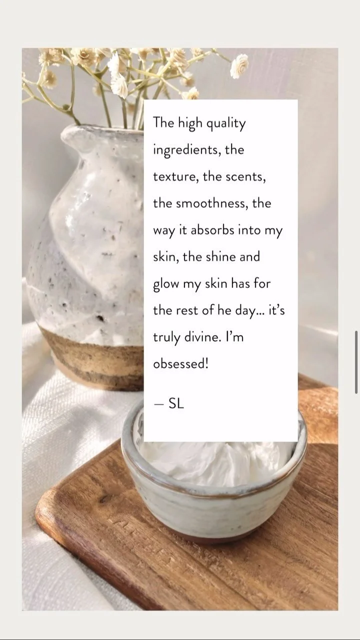 The high quality ingredients, the texture, the scents, the smoothness, the way it absorbs into my skin, the shine and glow my skin has for the rest of he day… it’s truly divine. I’m obsessed!